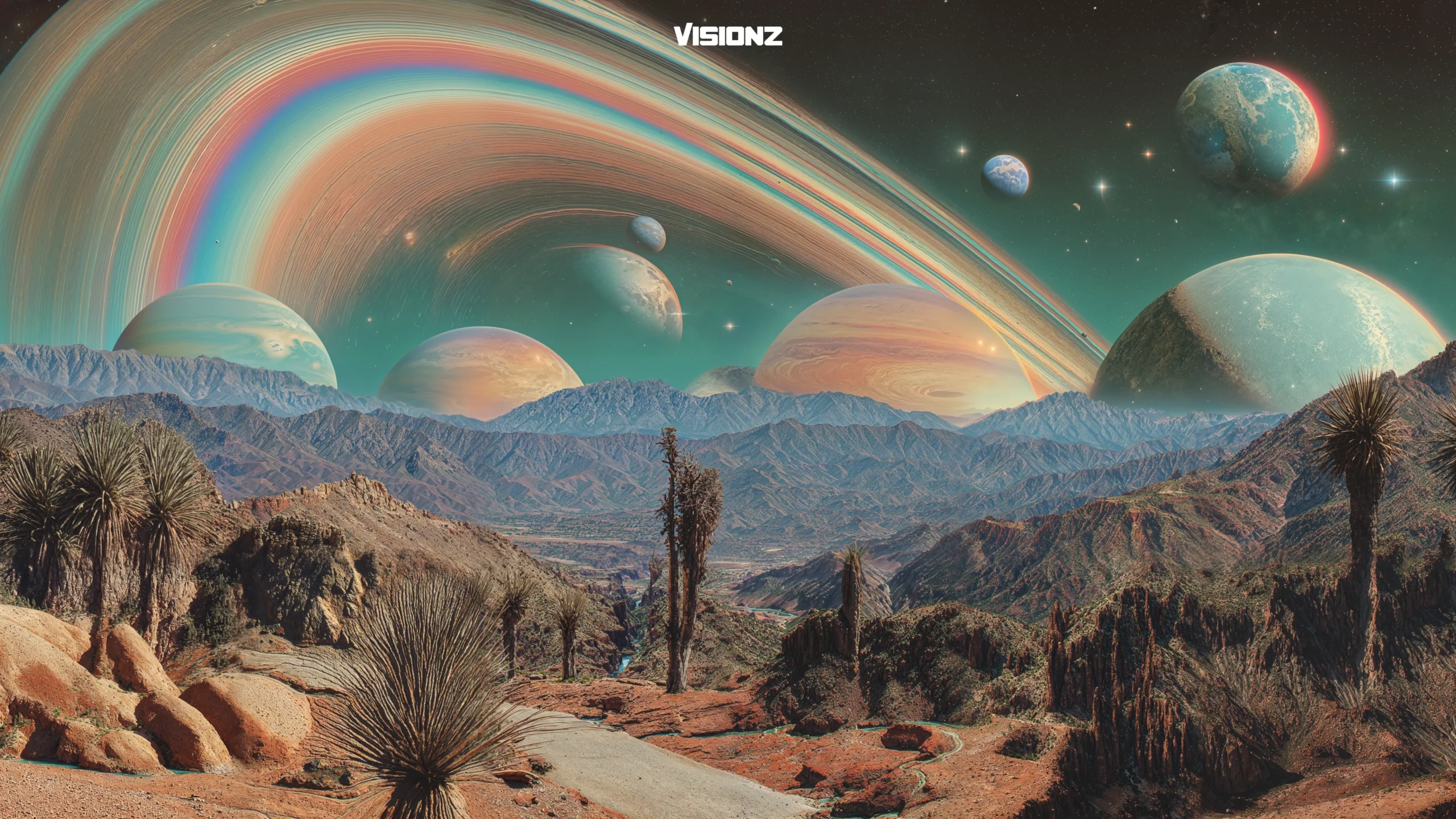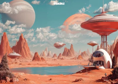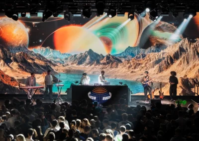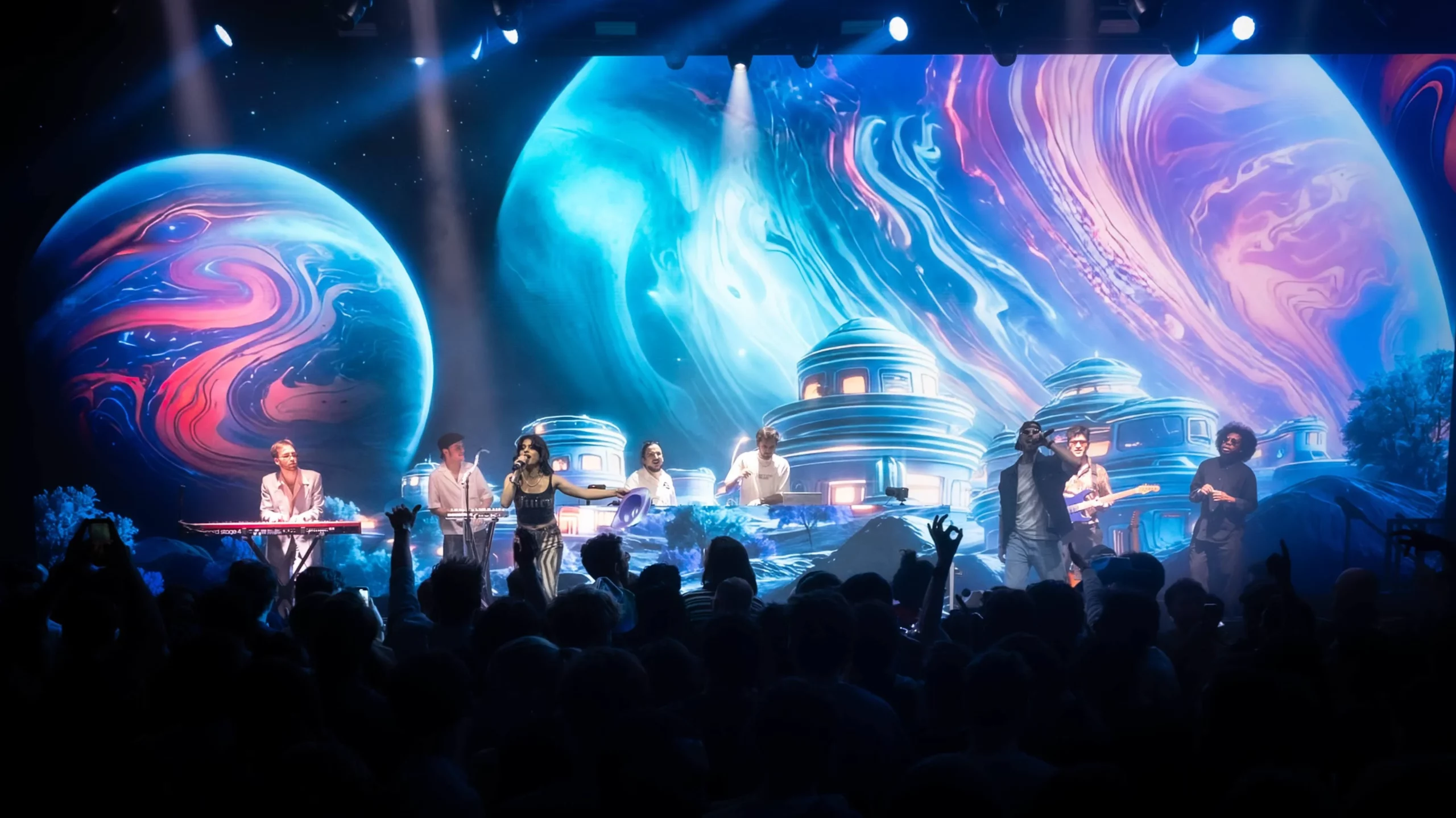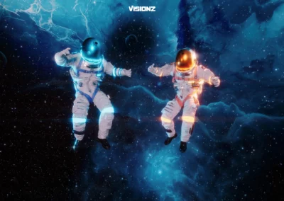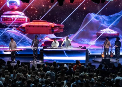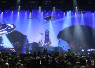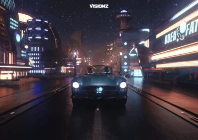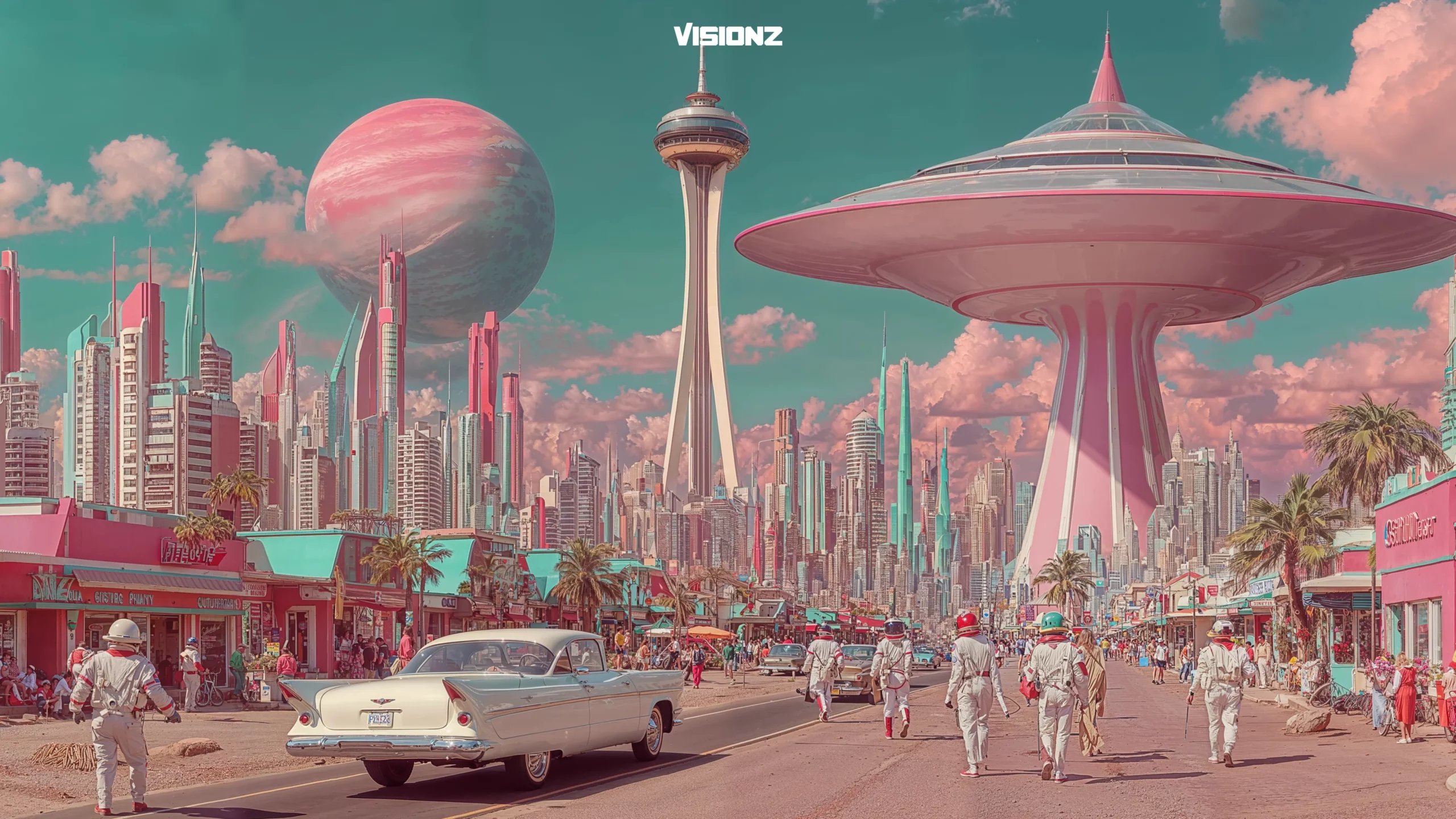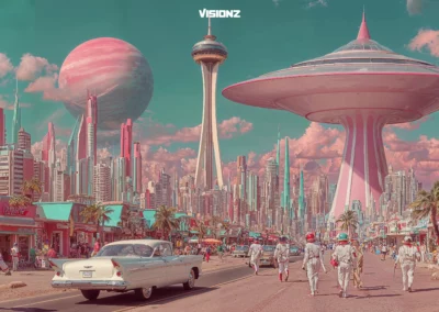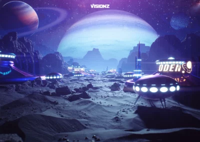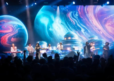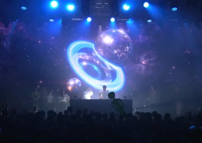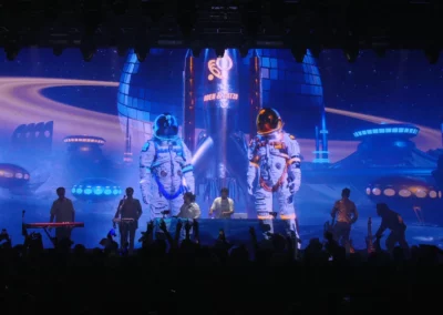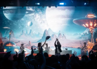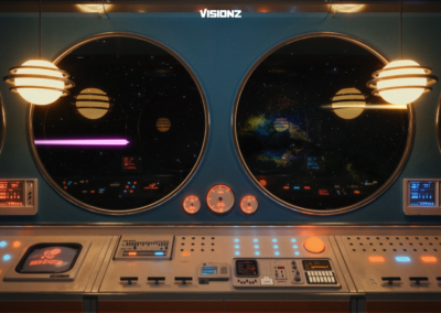 We developed the idea of taking the audience on a journey alongside them — starting from a retro-futuristic Earth, traveling through space, and exploring different planets across time and dimensions. The artistic direction consistently blends futuristic elements with a strong retro aesthetic inspired by the 60s to 80s.